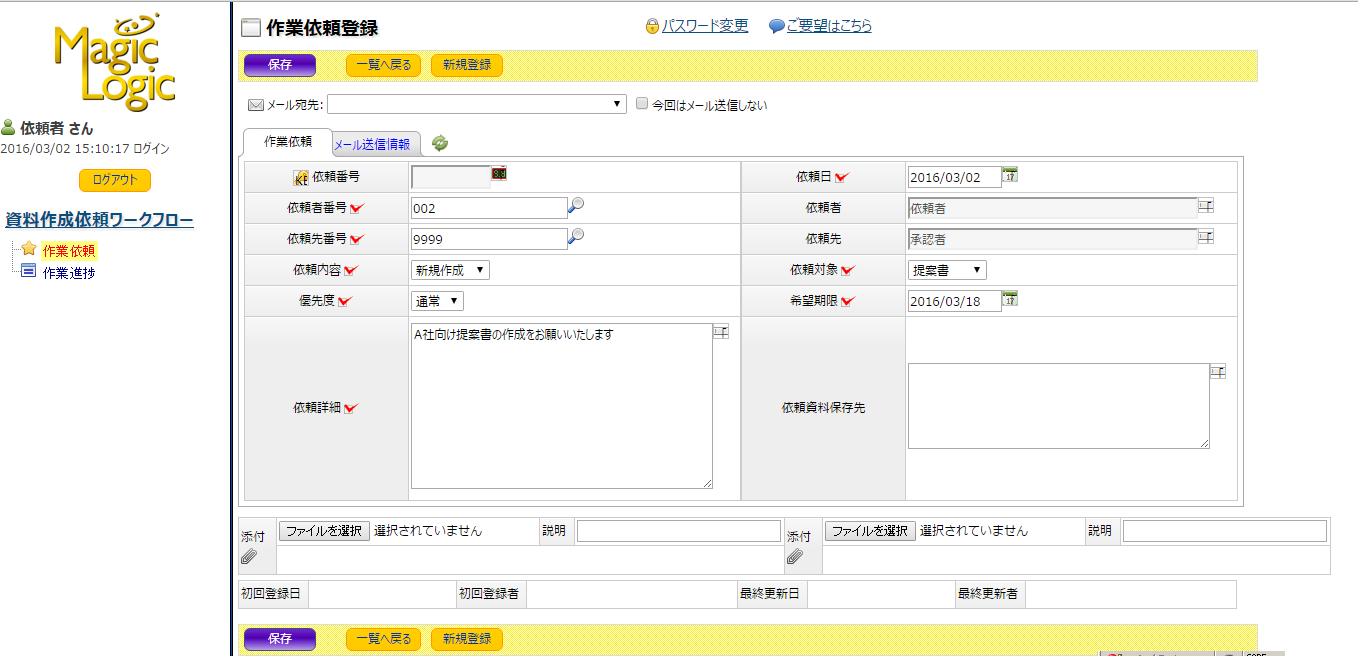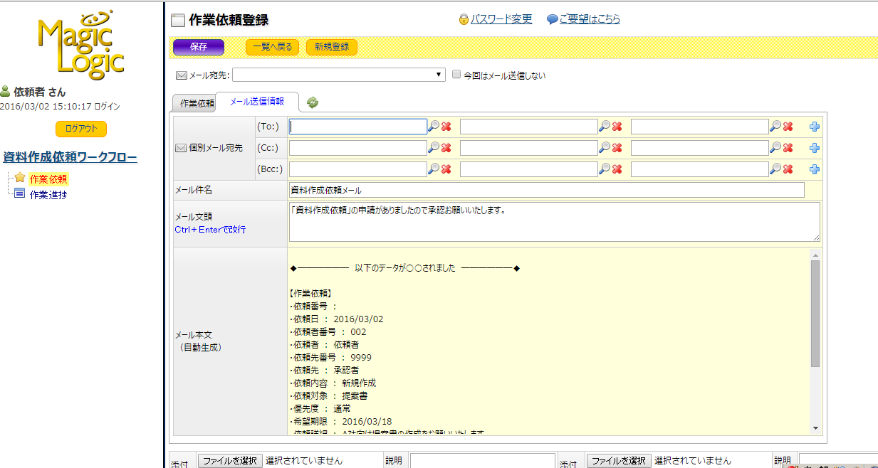 作業依頼を登録して、メールのあて先を指定。あとは保存するだけで作業依頼のメールが届きます。