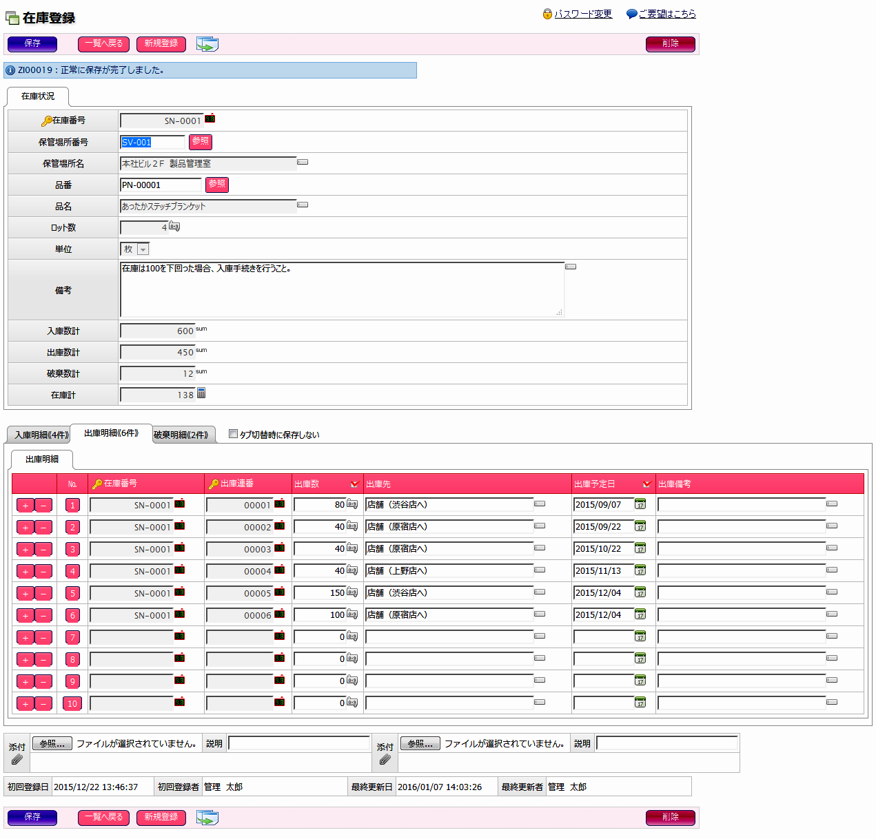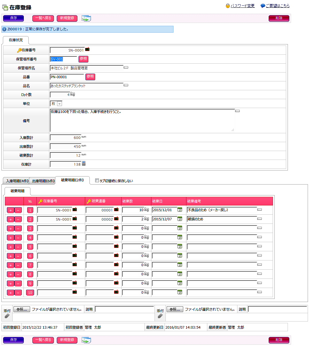 在庫の中の「入庫」「出庫」「破棄」のデータをそれぞれ管理し、結果的に現在どれくらい在庫があるのかを管理することができます。